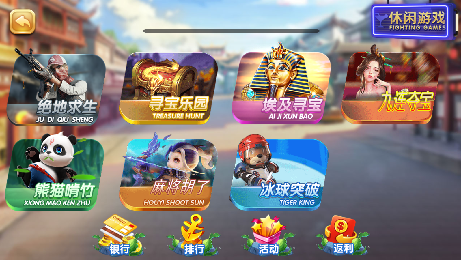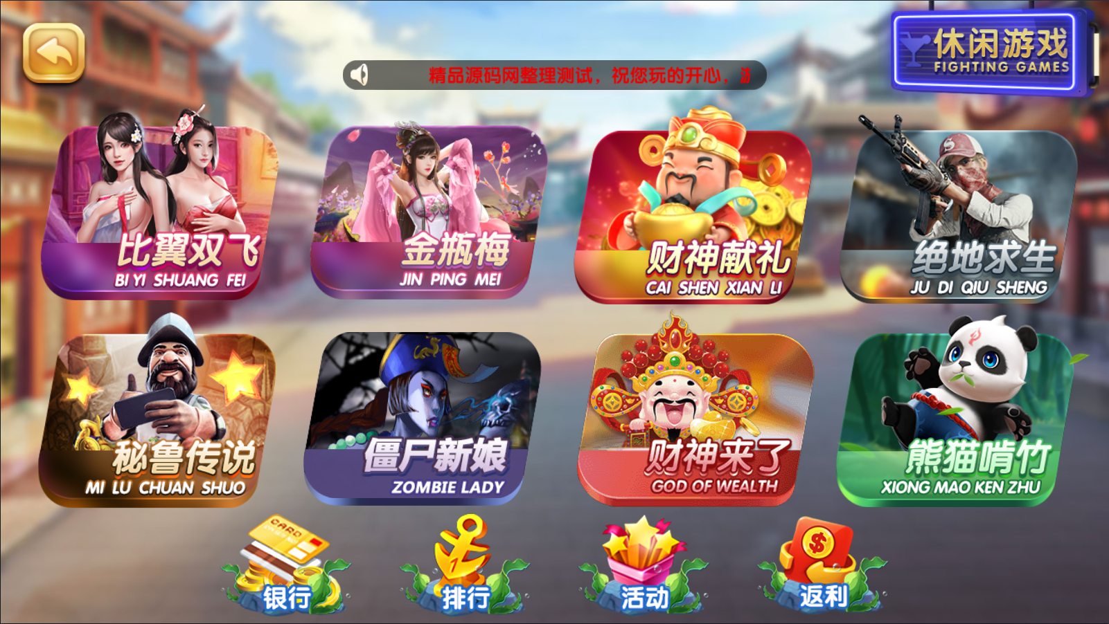 休闲类:比翼双飞,金瓶梅,财神献礼,密鲁传说,僵尸新娘,财神来了,绝地求生,熊猫啃竹,寻宝乐园,埃及寻宝,九连夺宝,麻将糊了,冰球突破。