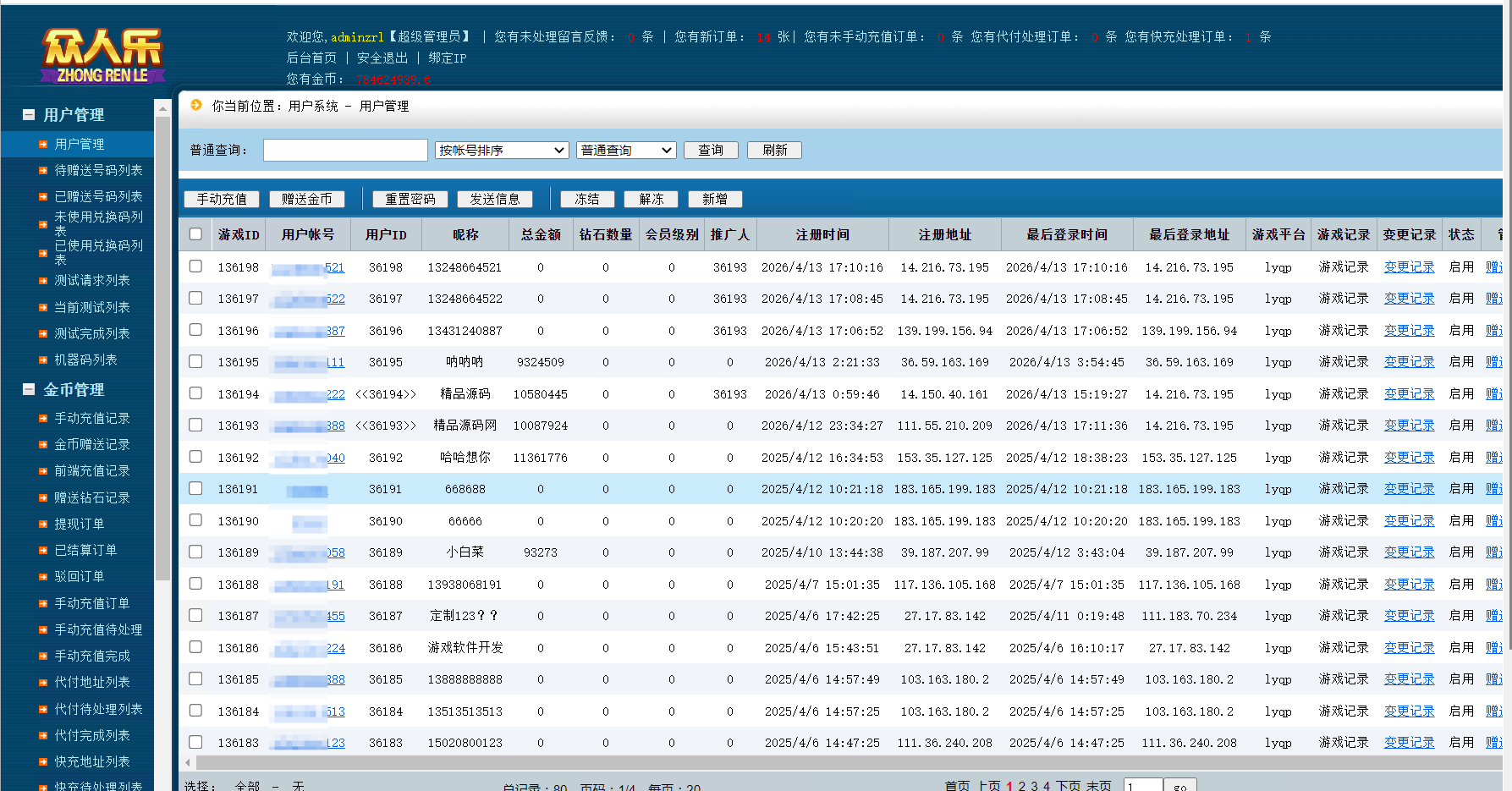 站长亲测众人乐完美运营服务端,全游戏正常后台控制正常可以对接自己的客服系统团队推广正常可用安卓苹果双端齐全
